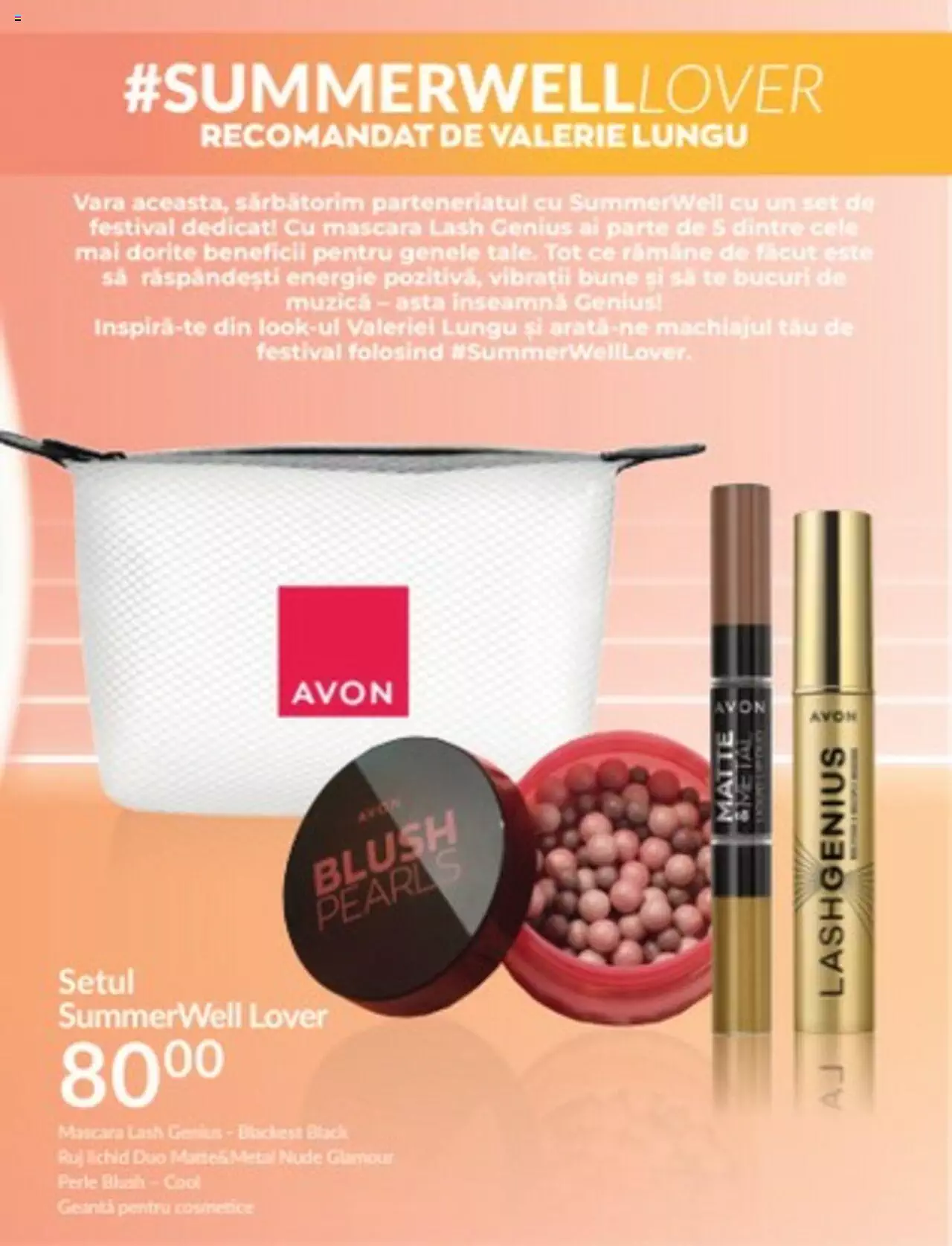 În catalogul Avon, vă invităm să vă pregătiți pentru festivalurile verii cu colecția noastră specială Lovestival. Descoperiți o gamă variată de produse care vă vor ajuta să străluciți și să vă exprimați stilul unic în timpul acestor evenimente pline de energie. De la machiaj vibrant și produse de îngrijire pentru piele, până la accesorii trendy și parfumuri seducătoare, avem tot ce aveți nevoie pentru a crea un look îndrăzneț și original. Fiți gata să dansați, să cântați și să vă bucurați de momente de neuitat alături de prieteni. Cu produsele noastre de calitate superioară și formulele inovatoare, veți avea încrederea că aspectul dumneavoastră va rezista pe tot parcursul festivalului. Alegeți dintr-o varietate de nuanțe și texturi care să vă pună în valoare frumusețea și să vă ofere o strălucire deosebită. Fii gata să strălucești și să-ți arăți spiritul festivalier cu Lovestival de la Avon!