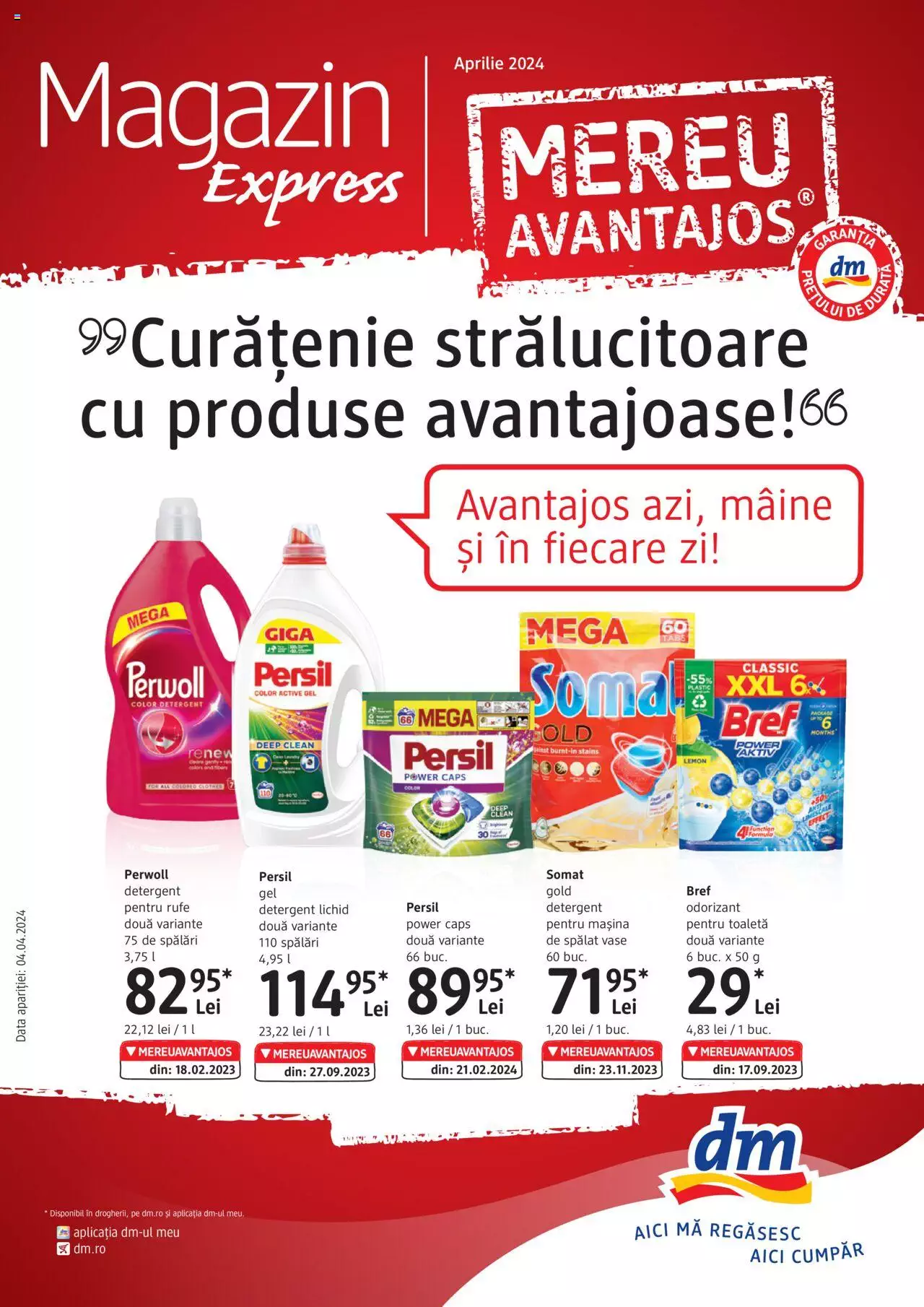 Obține o curățenie strălucitoare cu cele mai noi oferte din Catalogul DM - Express! Disponibil online începând cu 4 aprilie, acest catalog aduce reduceri speciale la o gamă variată de produse de curățenie. De la detergentul pentru rufe Persil și Somat, la soluțiile de curățat Bref și detergentul lichid pentru vase, găsești tot ce ai nevoie pentru a-ți menține casa impecabilă. Fie că vrei să speli rufele sau vasele, sau să împrospătezi aerul din casă, Catalogul DM - Express are tot ce îți trebuie. Aruncă o privire acum și profită de oferte avantajoase pentru a face achiziții inteligente!